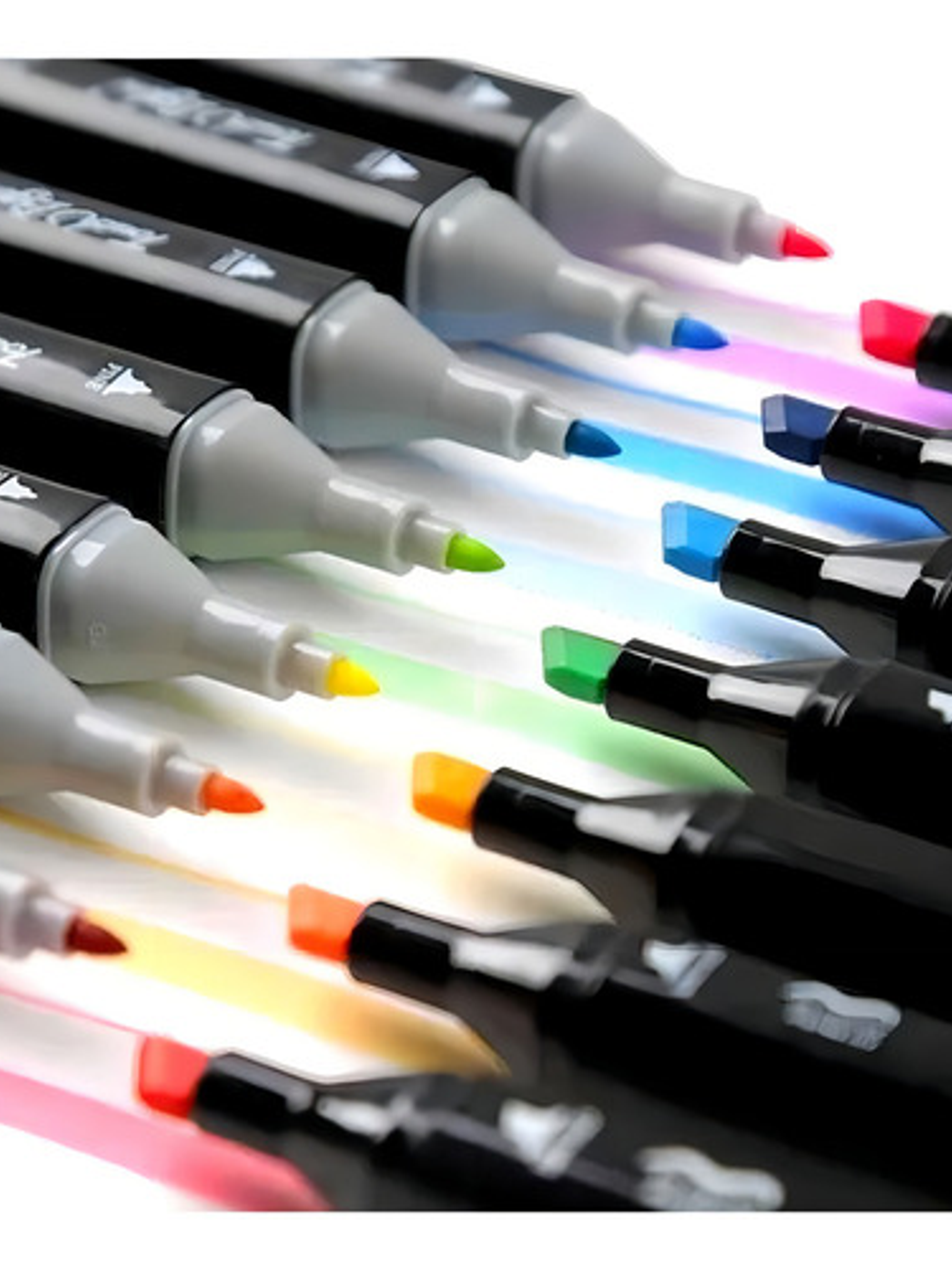 Marcadores de doble punta con tinta a base de alcohol, ideales para superficies de papel. Su trazo versátil de 1 mm y 6 mm permite precisión y cobertura amplia. Presentación en caja de 80 unidades con cuerpo de plástico resistente